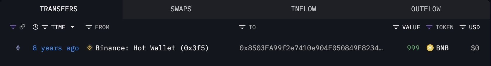 8 лет назад владелец адреса 0x850 купил 999 BNB, когда цена криптовалюты составляла около 1 доллара. Соответственно, он потратил на монеты чуть меньше тысячи долларов. Затем он вывел BNB с Binance на сторонний кошелёк и с тех пор не трогал крипту. В итоге сегодня её ценность на фоне рекорда курса подобралась к миллиону долларов. Это называется тысяча иксов.1 балл