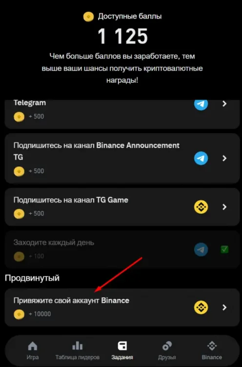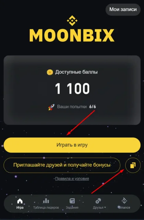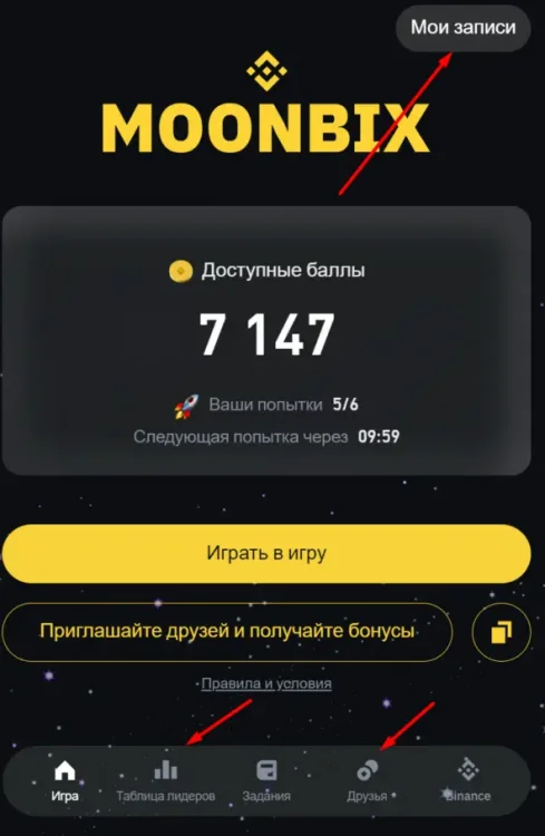 Перейти в MOONBIX Перейти в MOONBIX К числу таких бирж теперь присоединилась и Binance, запустив свой собственный бот — MoonBix. Binance, одна из крупнейших и наиболее влиятельных криптовалютных бирж в мире, продолжает расширять свои горизонты, создавая новые продукты и предложения для своих пользователей. Благодаря своей инновационной платформе и широкому спектру услуг, Binance завоевала доверие миллионов трейдеров и инвесторов по всему миру. В условиях быстро меняющегося крипторынка компания не останавливается на достигнутом и активно развивает новые направления. Одним из таких направлений стал запуск MoonBix Bot — уникальной тапалки в Telegram, которая позволяет пользователям зарабатывать криптовалюту за выполнение простых задач. Что делает MoonBix Bot особенным? Бот поддерживается самой биржей Binance, что гарантирует надежность и безопасность. Пользователи могут быть уверены, что их средства защищены, а бот легитимен. Выполняя задания и достигая определенных целей, пользователи могут зарабатывать токены. Это превращает участие в боте не только в развлечение, но и в способ получить реальные награды. Благодаря интуитивно понятному интерфейсу, даже новички легко освоятся и начнут зарабатывать с первого дня. Пользователи могут приглашать друзей, делиться своими успехами и получать дополнительные награды за активных рефералов. Это делает участие в MoonBix еще более интересным. Инструкция MoonBix Переходим в телеграм-бота Moonbix bot. Далее нажимаем "Ок", чтобы дать необходимые разрешения данному мини-приложению. Сразу же получаем бонус в 100 монет за ежедневный вход и кликаем кнопку "Продолжить" На главной странице видим большую кнопку "Играть в игру". Чуть ниже можно скопировать реферальную ссылку, чтобы приглашать друзей и получать за это бонусные монеты. В ходе самой игры необходимо запускать механическую клешню со своего звездолета, чтобы собрать ресурсы. Просто кликаем, когда клешня повернулась в желаемом направлении. На одну попытку дается 40 секунда времени. Всего попыток - шесть. Далее они восстанавливаются, около 20 минут на восстановление 1 попытки. Нужно собирать желтые камни. За большой дают 50 очков, за средний - 25, за маленький - 10. В подарочной коробке может быть 30, 60 или 100 очков (рандомно). Если поймали черные метеориты, то очки минусуются. Если нажать в нижней навигационной панели кнопку "Задания", то система перенаправит нас в соответствующий раздел, где можно быстро получить по 500 поинтов за выполнение активностей в социальных сетях. Но самый жирный бонус дают за привязку нашего верифицированного аккаунта Binance. Просто жмем на данное задание и система перекинет нас в браузер на биржу, далее следуем подсказкам для привязки профиля. Кроме того, в разделе "Таблица Лидеров", можно результаты топовых инфлюенсеров. В разделе "Друзья" промониторить всех своих приглашенных. После нажатия кнопку "Мои записи" в правом верхнем углу, можно увидеть историю всех поступающих транзакций. Выводы и личное мнение MoonBix Bot от Binance представляет собой интересный и перспективный инструмент для пользователей, желающих зарабатывать криптовалюту в простом и увлекательном формате. Кликер привлекает своей простотой, доступностью и возможностью получать реальные награды за минимальные усилия. Благодаря поддержке крупнейшей криптобиржи, пользователи могут быть уверены в надежнос