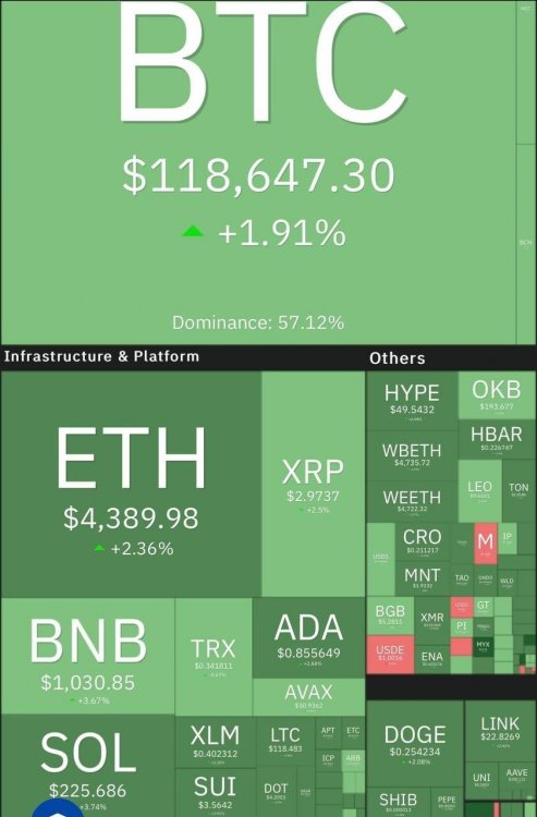 Биткоин достиг $119 000, эфир — $4 400. Альты из топ-100 показывают взрывной рост.