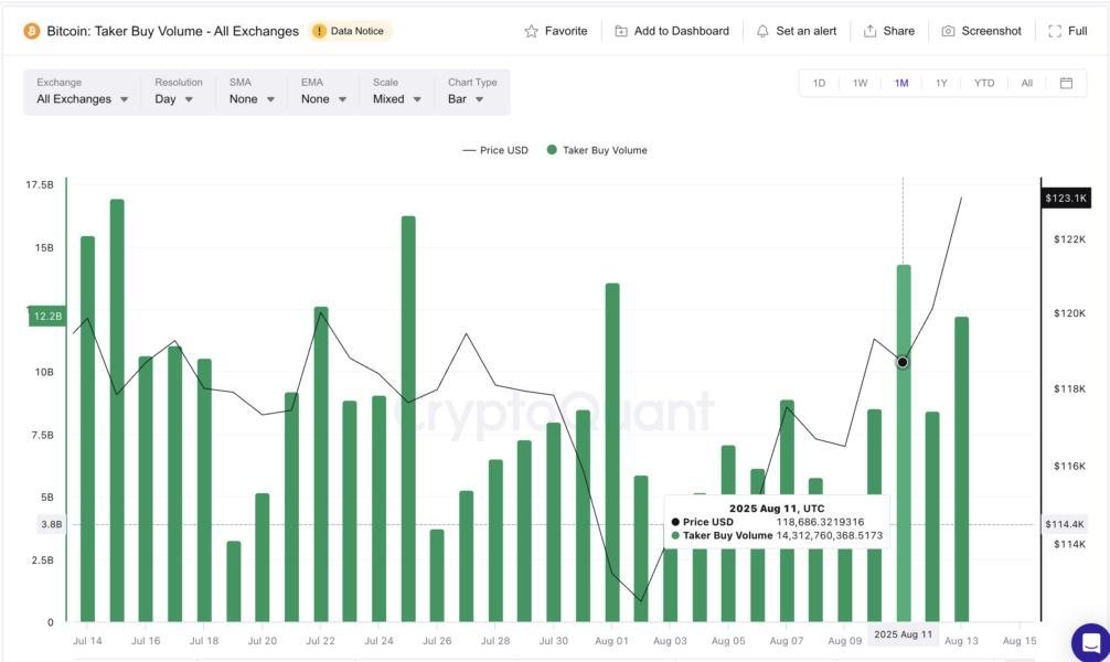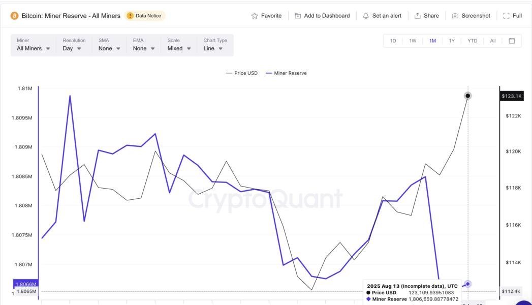 Цена биткоина достигла нового рекорда, превысив $124 000. За последнюю неделю BTC вырос почти на 8% Это произошло благодаря изменениям в ончейн-индикаторах, которые поддерживают быков. Агрессивные покупки на рынке бессрочных контрактов продолжались несколько дней. Теперь быки могут стремиться к новым высотам, так как текущие события благоприятствуют росту биткоина. Резервы майнеров снижаются, давление продаж ослабевает В начале месяца резервы майнеров выросли с 1 806 790 BTC 2 августа до 1 808 488 BTC 10 августа, что увеличило риск предложения на рынке. Это отразило усиление давления со стороны продавцов-майнеров, что часто мешает ралли. Но когда цена биткоина начала расти, резервы снизились до 1 806 630 BTC и остаются стабильными, указывая на ослабление риска продаж. Это открыло путь для покупателей, чтобы поднять рынок без значительных продаж со стороны майнеров. Резервы майнеров: общее количество BTC, удерживаемое майнерами. Рост резервов может указывать на возможное давление продаж, а их снижение часто уменьшает угрозу со стороны предложения. Объем покупок тейкеров показывает готовность быков Объем покупок тейкеров — это общая стоимость рыночных ордеров на покупку, которые снимают ликвидность с продаж. 11 августа он достиг $14,31 млрд во время неудачной попытки прорыва. Чтобы рыночный ордер на покупку был выполнен, он должен «ударить» по ордерам на продажу, уже находящимся в книге ордеров. Таким образом, покупатели приобретают активы по текущей цене продавца, не дожидаясь более выгодной сделки. Высокий объем покупок тейкеров означает, что активные покупатели быстро убирают ликвидность с продаж, что может поднять цену, если давление продолжится. Этот показатель остается на уровне $12,24 млрд, что говорит о том, что трейдеры продолжают покупать по текущей цене, не ожидая снижения. Часто, когда покупатели проявляют устойчивую активность, это предвещает успешные прорывы. Вопрос был не в том, вырастет ли цена до новых максимумов, а когда это произойдет. Ключевые уровни цены биткоина, которые стоит отслеживать Сейчас, когда импульс на стороне быков, ближайшее испытание — уровень $124 300, последний значительный барьер перед достижением более высоких целей. Если цена уверенно преодолеет этот уровень и закроется выше, это может открыть путь к $127 600, что соответствует 1,0 расширению Фибоначчи и является следующей важной целью роста. Однако, если биткоин не удержится выше $121 600, особенно на фоне роста резервов майнеров, бычий сценарий может столкнуться с резким откатом.