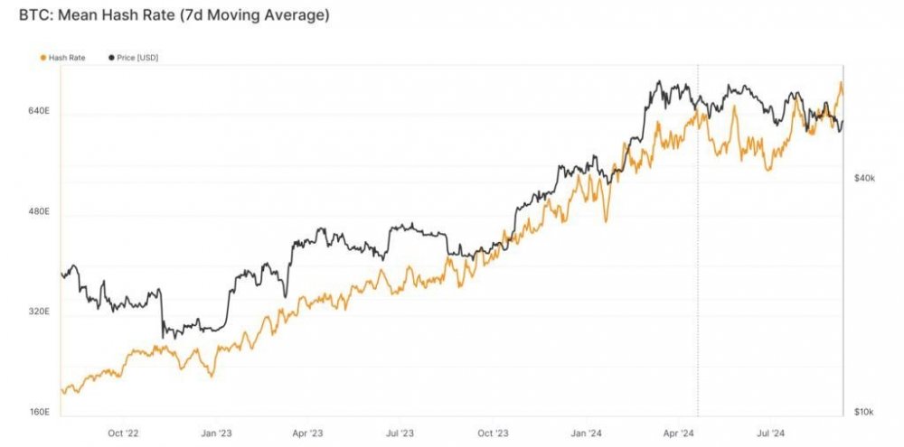 По данным Glassnode, 8 сентября хешрейт биткоина (сглаженный 7-дневной скользящей средней показатель) достиг максимума на отметке 693,9 EH/s. Показатель скорректировался к уровню около 672 EH/s.