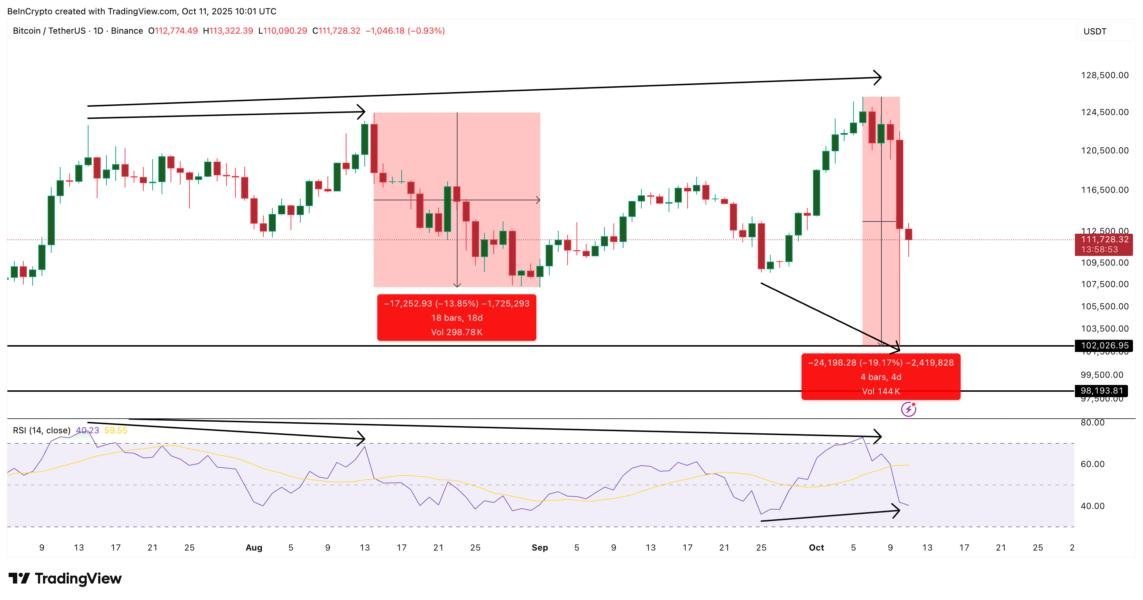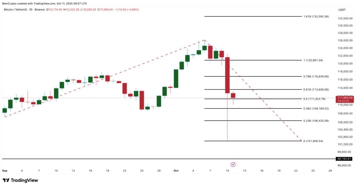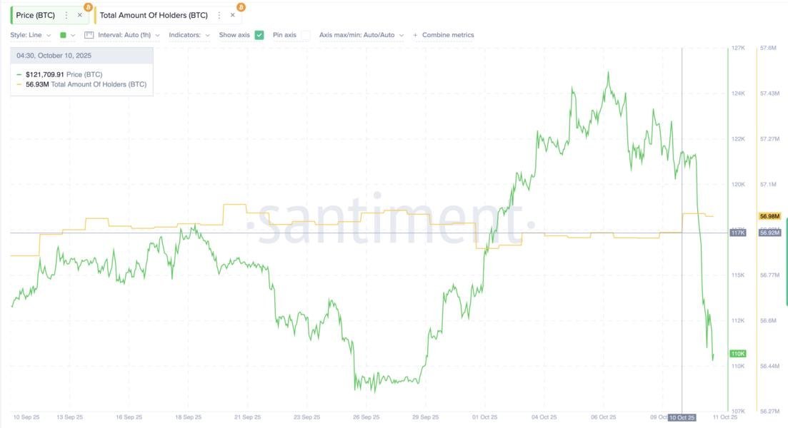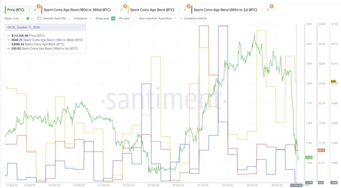 Биткоин падает, но холдеры не паникуют Резкое снижение цены биткоина встревожило трейдеров: BTC упал с более чем $120 800 до $102 000, после чего быстро отскочил на 9% — до $111 000. Несмотря на масштаб ликвидаций, биткоин показал относительную устойчивость, снизившись всего на 7%, что говорит о силе текущего тренда. Главный вопрос теперь — сможет ли BTC удержаться выше $100 000 или вскоре пробьет эту ключевую поддержку. Поведение долгосрочных держателей (холдеров) — первый признак стабильности рынка. Даже во время падения число адресов с ненулевым балансом выросло с 56,92 млн до 56,98 млн всего за сутки. Это означает, что инвесторы не спешили продавать, а наоборот — использовали снижение для покупки. Данные ончейн-аналитики подтверждают эту тенденцию. Показатель Spent Coin Age Bands (SCAB) показывает, какие монеты двигаются в сети — те, что недавно куплены, или те, что удерживаются месяцами и годами. 10 октября, в момент начала распродажи, общий объем перемещенных монет составлял около 17 100 BTC. При этом монеты возрастом от 180 до 365 дней (красная зона) составляли примерно 9 995 BTC, а от 1 до 2 лет (синяя зона) — около 2 452 BTC. Когда давление продаж усилилось, общий SCAB вырос до 23 086 BTC — признак того, что активность в сети резко увеличилась за счет краткосрочных инвесторов. В то же время доля «старых» монет снизилась: диапазон 180–365 дней упал до 9 646 BTC, а 365 дней–2 года — до 535 BTC. Это означает, что распродажа исходила в основном от новых и среднесрочных участников рынка, тогда как долгосрочные держатели оставались спокойными. Обычно опытные инвесторы сохраняют позиции, если не ждут серьезного обвала — например, ниже $100 000. Рост числа холдеров при одновременной пассивности «ветеранов» указывает на перераспределение монет в пользу тех, кто готов держать актив даже в условиях повышенной волатильности. Такой сдвиг структуры владения часто становится предпосылкой для восстановления рынка. Ценовой импульс сменился с медвежьего на бычий Техническая картина показывает, что недавнее падение было не просто следствием паники на рынке, а частью закономерного цикла. Обвал совпал с формированием медвежьей дивергенции на индикаторе RSI (индекс относительной силы), который измеряет баланс покупок и продаж по шкале от 0 до 100. Дивергенция возникает, когда цена и RSI движутся в противоположных направлениях — например, курс обновляет максимум, а индикатор показывает более низкий пик. Это говорит о том, что импульс покупок ослабевает, и часто предвещает коррекцию. Именно такая ситуация наблюдалась с середины июля по начало октября: биткоин обновил исторические максимумы, но RSI их не подтвердил. В результате последовало падение почти на 19% — аналогичное коррекции в 14%, которая произошла ранее по тому же техническому сигналу. Сейчас рынок демонстрирует обратную картину. С 25 сентября по 11 октября на графике появилась бычья дивергенция: цена сформировала более низкий минимум, а RSI — более высокий. Это указывает на ослабление давления продаж и возможное восстановление восходящего импульса. На момент публикации биткоин торгуется около $111 600, что соответствует уровню 0,5 по сетке Фибоначчи ($111 400). Если дневная свеча закроется выше этой отметки, следующим целями могут стать уровни $113 600, $116 800 и $120 800. Критическая зона поддержки находится у отметки $109 100. При снижении цены ближайшие рубежи защиты расположены н