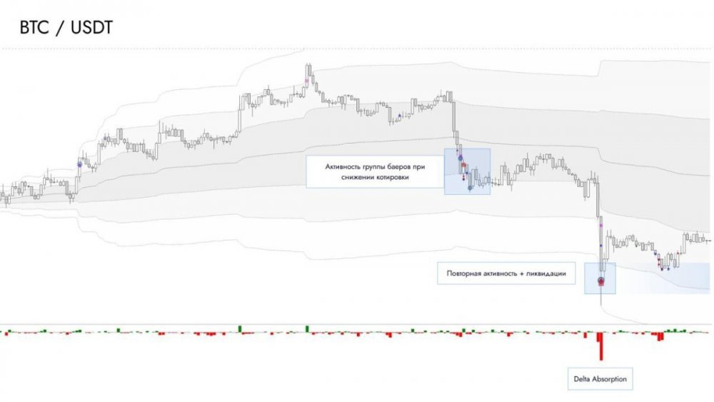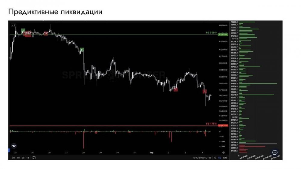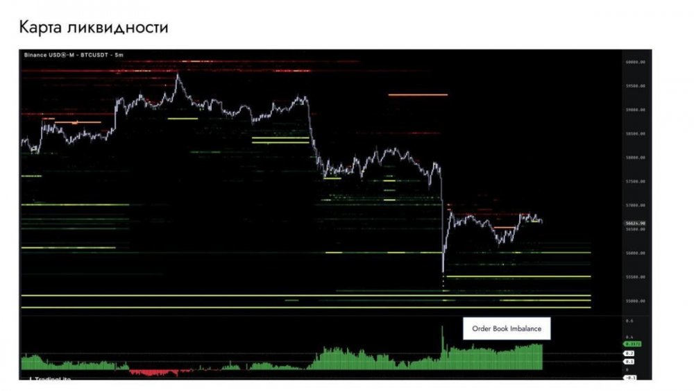 BTC аналитика Биткоин предпринял попытку выхода за VA 57.850$ - 60.850$. При снижении котировка попала в -3 отклонение по VWAP текущей недели и в VAL предыдущего месяца. Хорошая почва для возобновления лонгового контекста, однако в идеале необходимо получить закрепление выше 57.850$ В зоне 56.000$ появилась аномальная кластерная активность, указывающая на появления крупного капитала. Также наблюдалась аномальная активность HFT алгоритмов По CVD осталось лишь долгосрочное поглощение. Однако локально появился absorption на лоях по столбиковой дельте Ближайший массив предиктивных ликвидаций лонгистов: 53.475$. Шортистов: 58.889$ Дисбаланс в ордербуке в сторону покупок, сработавшие ликвидации и аномалии по скорости ленты говорят в пользу вероятности лонгового сценария Приоритетный сценарий: незначительная коррекция с текущих цен в область спроса 56.350$ с возобновлением роста