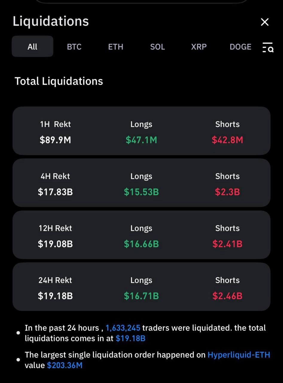 alex12 Опубликовано 11 октября Поделиться Опубликовано 11 октября 19 ярдов. Самая крупная ликвидация в истории крипторынка. Это в 10 раз хуже, чем видел рынок во время краха FTX и почти в 20, чем в ковид-обвал На деле эта цифра может быть куда больше, тк Binance не полностью раскрыл инфу о ликвидациях (по сообщениям Coinglass). Наиболее крупная ликвидация случилась на Hyperliquid в ETH (кто-то потерял $200+ лямов). $4.5 ярда ликвидировано на Bybit Слухи на тему, что ликвиднулся кто-то очень крупный (фонд?), проблемы также могут быть у маркетмейкеров Параллельно OG кит (инсайдер?), который незадолго до твитов Трампа встал в шорт на ярд, вынес с рынка порядка $160 млн чистой прибыли Примечателен также тот факт, что два худших дня в истории крипторынка случились при «криптопрезиденте» Трампе, а триггером оба раза выступили его твиты Когда твоя "гениальная инвестиция в мем-токены" пошла не по плану: Ссылка на комментарий Поделиться на другие сайты Поделиться