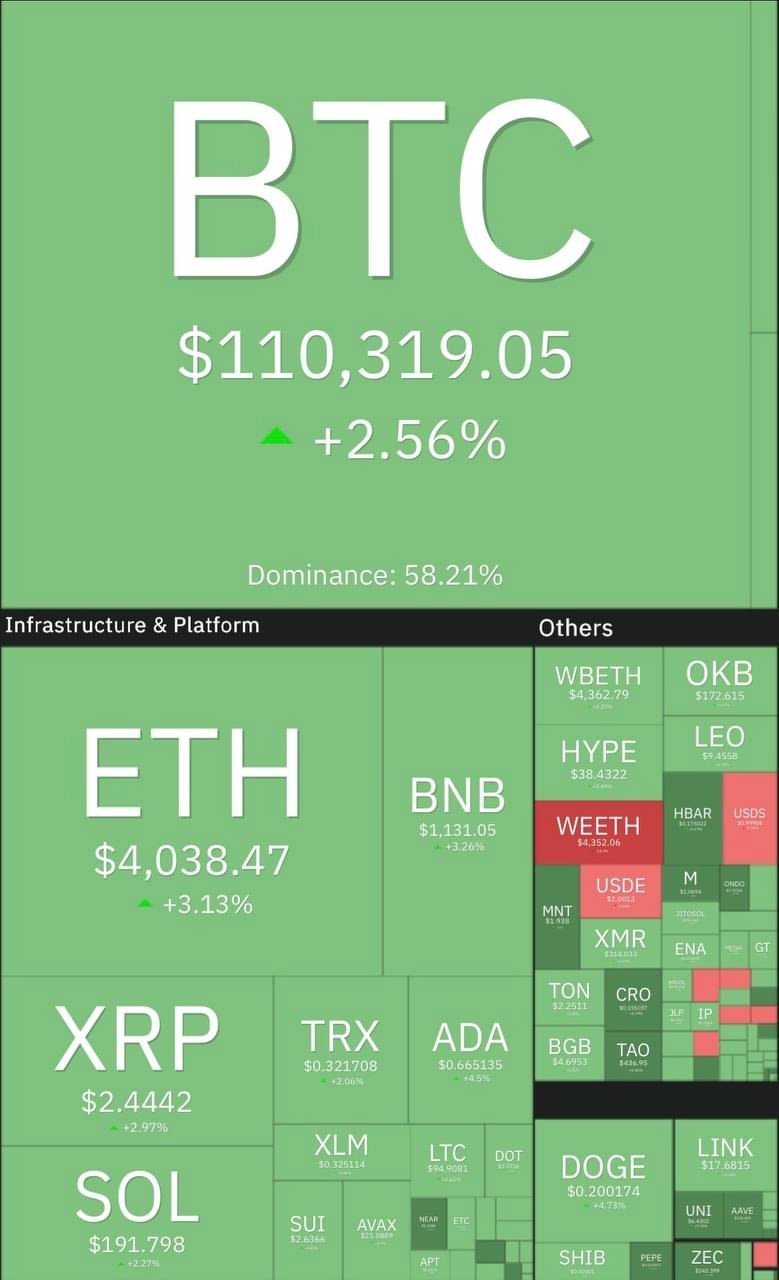 ammo Опубликовано 20 октября Поделиться Опубликовано 20 октября Биткоин вернул себе цену в $$110 000, эфир — $4 000. Практически вся крипта из топ-100 в зеленой зоне. Лидеры роста: SNX +16%, MNT +11%, FET +10%. Индекс страха и жадности вырос из зоны чрезвычайного страха в зону просто страха — 29. Индекс альтсезона 26. Ссылка на комментарий Поделиться на другие сайты Поделиться