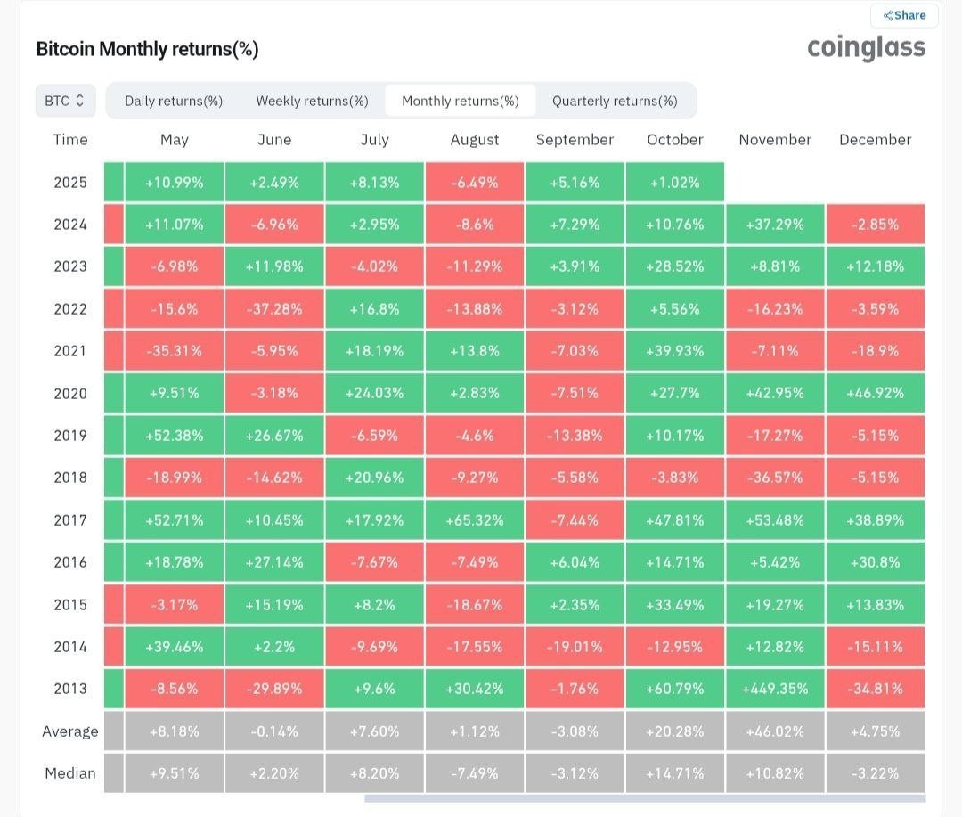 Ren Опубликовано 28 октября Поделиться Опубликовано 28 октября Биткоин вышел в зеленую зону в рамках октябрьской доходности Уже не Rectober, но еще не Uptober Наиболее сильным исторически месяцем для BTC является ноябрь Будет жаль тех, кого вытряхнули в октябре (а ведь были и настоящие трагедии ценой в человеческие жизни) Ссылка на комментарий Поделиться на другие сайты Поделиться