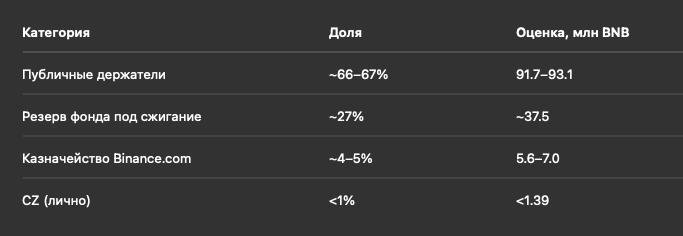 DonSimon Опубликовано 29 октября Поделиться Опубликовано 29 октября CZ лично владеет менее 1% BNB Публичные адреса — 66-67%. Это широкая масса кошельков, включая депозиты на централизованных биржах. 27% — BNB Foundation. Монеты лежат для сжигания, не для продажи. 4-5% — казначейство Binance. Лично у CZ 1.39 млн BNB. Ссылка на комментарий Поделиться на другие сайты Поделиться