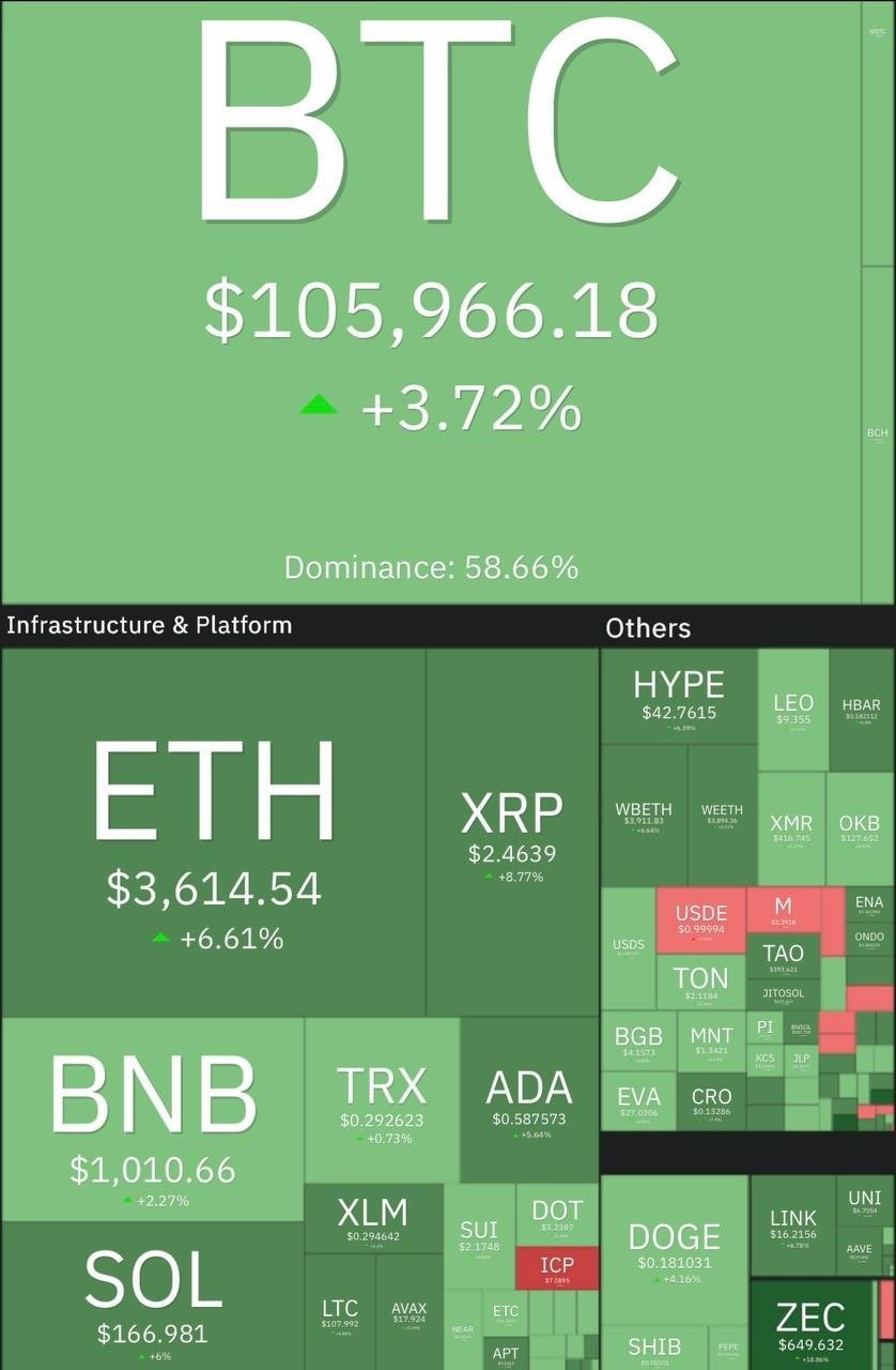 Tiny Опубликовано 10 ноября Поделиться Опубликовано 10 ноября Биткоин вырос до $106 000, эфир — до $3 600. Почти все альты из топ-100 растут. Лидеры роста за последние сутки: STRK +21%, ZEC +19%, VIRTUAL +17%. Среди падающих активов: ICP -7%, SOON -4%. С 3 по 7 ноября спотовые ETF на биткоин зафиксировали недельный чистый отток в размере $1.22 млрд, что является третьим по величине в истории. Спотовые ETF на Ethereum зафиксировали недельный чистый отток в размере $508 млн, также третий по величине в истории. Спотовые ETF на Solana показали недельный чистый приток в размере $137 млн. Индекс страха и жадности равен 29 — страх. Ссылка на комментарий Поделиться на другие сайты Поделиться