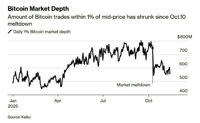 Cryziz Опубликовано 18 ноября Поделиться Опубликовано 18 ноября Глубина рынка Биткоина упала приблизительно на 30% от максимумов показателя в этом году. Речь идёт об объёме сделок, необходимом для изменения курса BTC на 1%. Иначе говоря, рынку сейчас сложнее поглощать крупные операции без резкого изменения цен. Ссылка на комментарий Поделиться на другие сайты Поделиться