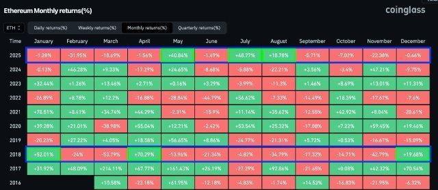 Похоже, 2025 окажется вторым худшим годом для Эфириума. Криптовалюта зафиксировала только три зелёных месяца.