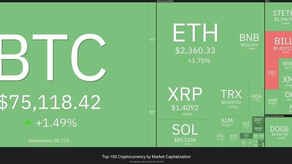 Биткоин удерживает $75 000, существенных провалов не наблюдается. Альты из топ-100 демонстрируют преимущественно растущую динамику.